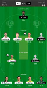 L.Das, D.Warner, S.Smith, A.Finch (C), N.Sheikh, G.Maxwell (VC), M.Hasan, M.Starc, J.Hazlewood, A.Zampa, M.Rahman