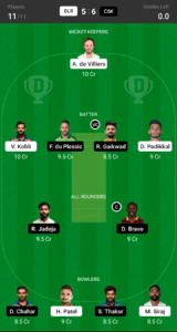 A.de Villiers, F.du Plessis, R.Gaikwad (VC), V.Kohli, D.Padikkal, R.Jadeja, D.Bravo (C), D.Chahar, S.Thakur, H.Patel, M.Siraj