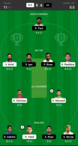 R.Pant, V.Kohli, D.Padikkal, S.Iyer, P.Shaw, D.Christian, G.Maxwell (VC), H.Patel (C), R.Ashwin, A.Khan, A.Nortje