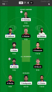Conway (C), Gaikwad, Rahane, Dube, Warner, Rossouw, Jadeja (VC), Marsh, Deshpande, Chahar, Nortje