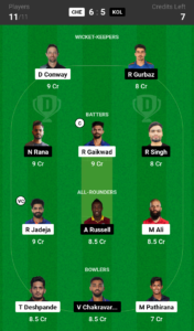 Conway, Gurbaz, Gaikwad (C), Rana, Singh, Jadeja (VC), Ali, Russell, Deshpande, Pathirana, Chakravarthy