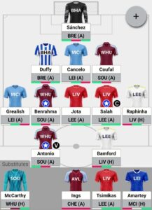 Sanchez (GK), Coufal, Cancelo, Duffy, Jota, Salah (C), Raphinha, Benrahma, Grealish, Bamford, Antonio (VC)