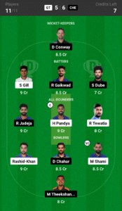 Conway, Gill, Gaikwad, Dube, Pandya (C), Tewatia, Jadeja, Rashid-Khan, Shami (VC), Chahar, Theekshana