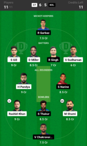 Gurbaz, Gill, Miller, Sudharsan, Singh, Pandya, Narine, Rashid-Khan (C), Shami (VC), Thakur, Chakravarthy