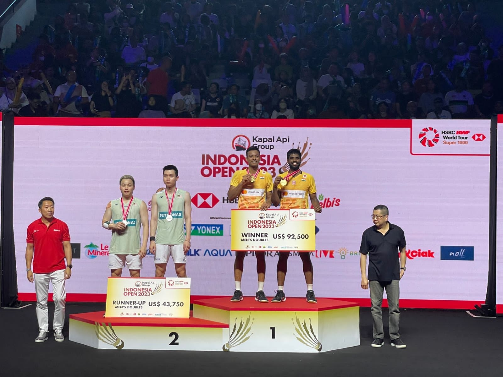 Jakarta, June 18 The men’s doubles pair of Satwiksairaj Rankireddy/Chirag Shetty on Sunday scripted history as they became the first ever Indians to lift a Super 1000 title after winning the final of Indonesia Open 2023 badminton championship against Malaysia’s Aaron Chia/Soh Wooi Yik, here.