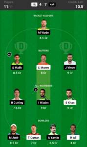 Imad Wasim (9.0 Cr) managed to score a brilliant 57 runs at an strike rate of 190 to keep his side in the game which makes him our prime choice for this contest.