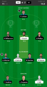 Latham (C), Azam, Phillips, Williamson, Salman, Nawaz, Santner, Mitchell (VC), Mir, Ferguson. Southee