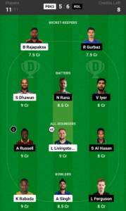 Rajapaksa, Gurbaz, Dhawan, Rana, Iyer, Livingstone (VC), Al Hasan, Russell (VC), Rabada, Singh, Ferguson