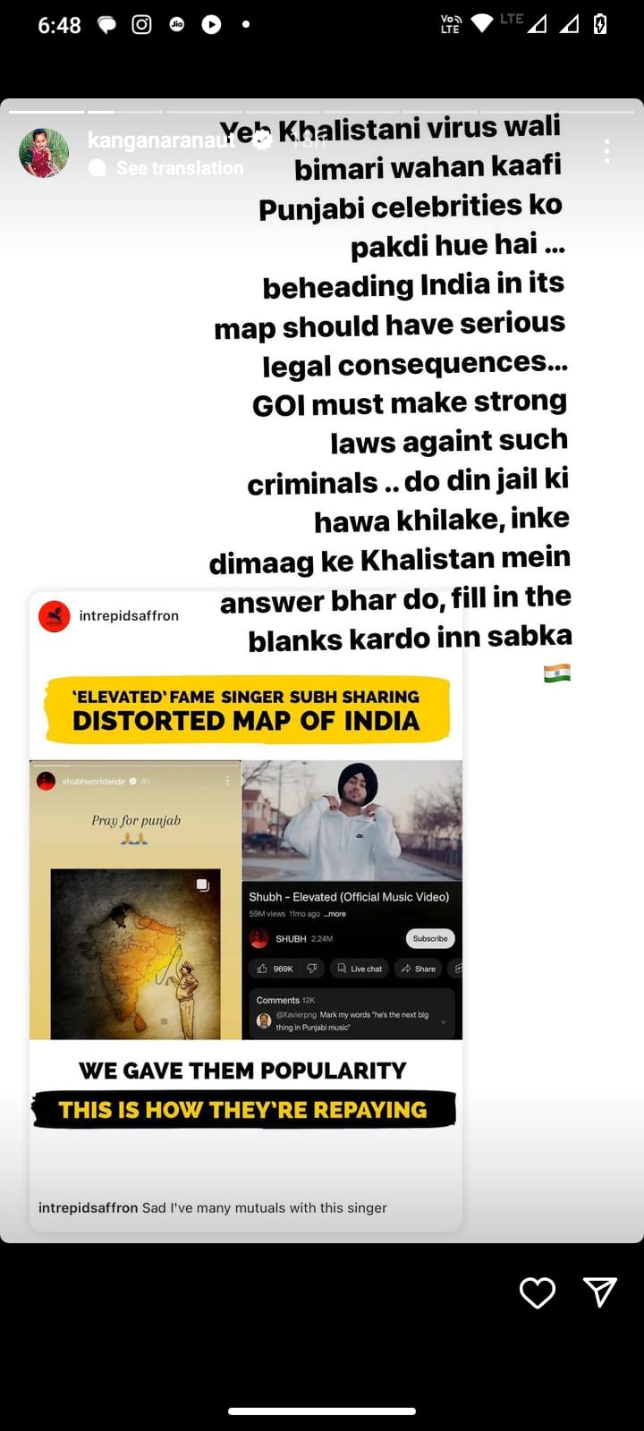Her Instagram post reads, ‘Yeh Khalistani virus Wali bhimari wahan kaafi Punjabi celebrities Jo pakdi hue hai. When India is depicted as being beheaded on a map, there should be severe legal repercussions. The GOI needs to enact strict laws to stop these criminals. Do din prison ki hawa khilake, inke dimaag ke Khalistan mei response bhar do, fill in the blanks kardo inn sabka’ and after that, she inserts India’s flag emoji. The Punjabi community and her supporters are reacting angrily to Kangana Ranaut’s statement.