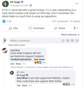 However, the malicious and brain dead elements of the society failed to revel in the country’s triumph. An user by the name of Zaid Bhatt who claimed to be from Kashmir, commented on RP Singh’s post, telling him how all Kashmiri would be supporting England during the showdown.