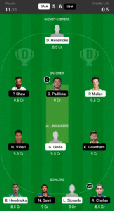D.Hendricks, P.Malan, P.Shaw, D.Padikkal (C), G.Linde, K.Gowtham, H.Vihari, B.Hendrick, L.Sipamla, R.Chahar (VC), N.Saini