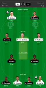 Q.de Kock (VC), N.Pooran, R.van der-Dussen, A.MArkram, E.Lewis, D.Bravo, A.Russell, K.Rabada, A.Nortje (VC), A.Hosein, R.Rampaul