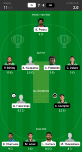 K.Perera, A.Fernando, B.Rajapaksa, P.Stirling, G.delany, W.Hasaranga (C), C.Campher (VC), D.Chameera, L.Kumara, M.Theekshana, M.Adair