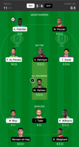 N.Pooran, A.Fletcher (VC), F.du Plessis, T.David, S.Hetmyer, M.Hafeez (C), W.Riza, K.Williams, I.Tahir, Naveen-Ul-Haq, R.Shepherd