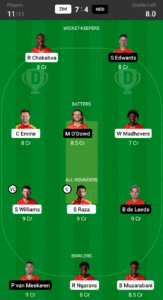 Chakabva, Edwards, Ervine, Madhevere, O’Dowd, Raza (C), Williams (VC), de Leede, Ngarava, Muzarabani, van Meekerern